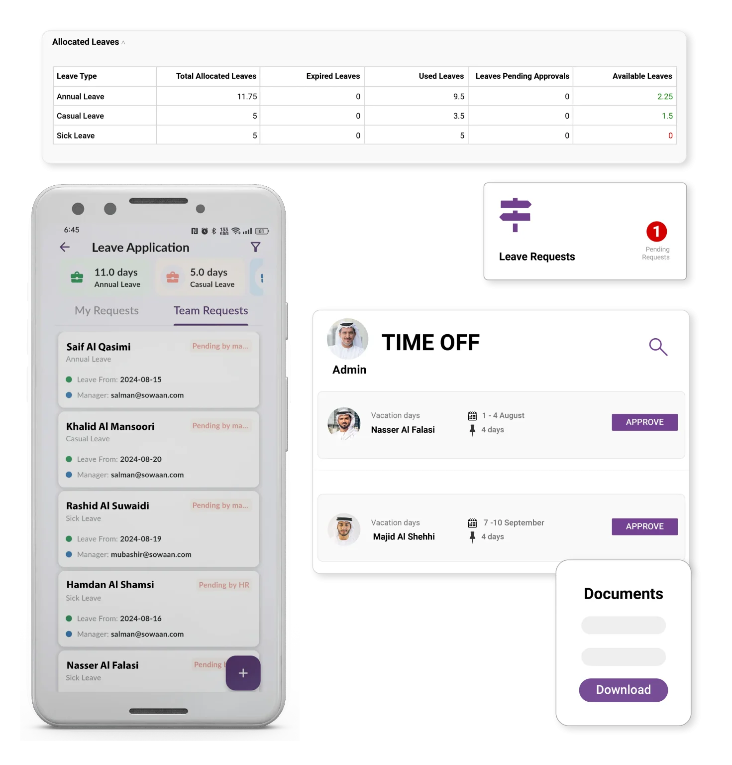 Leave requests, approvals, and balance tracking